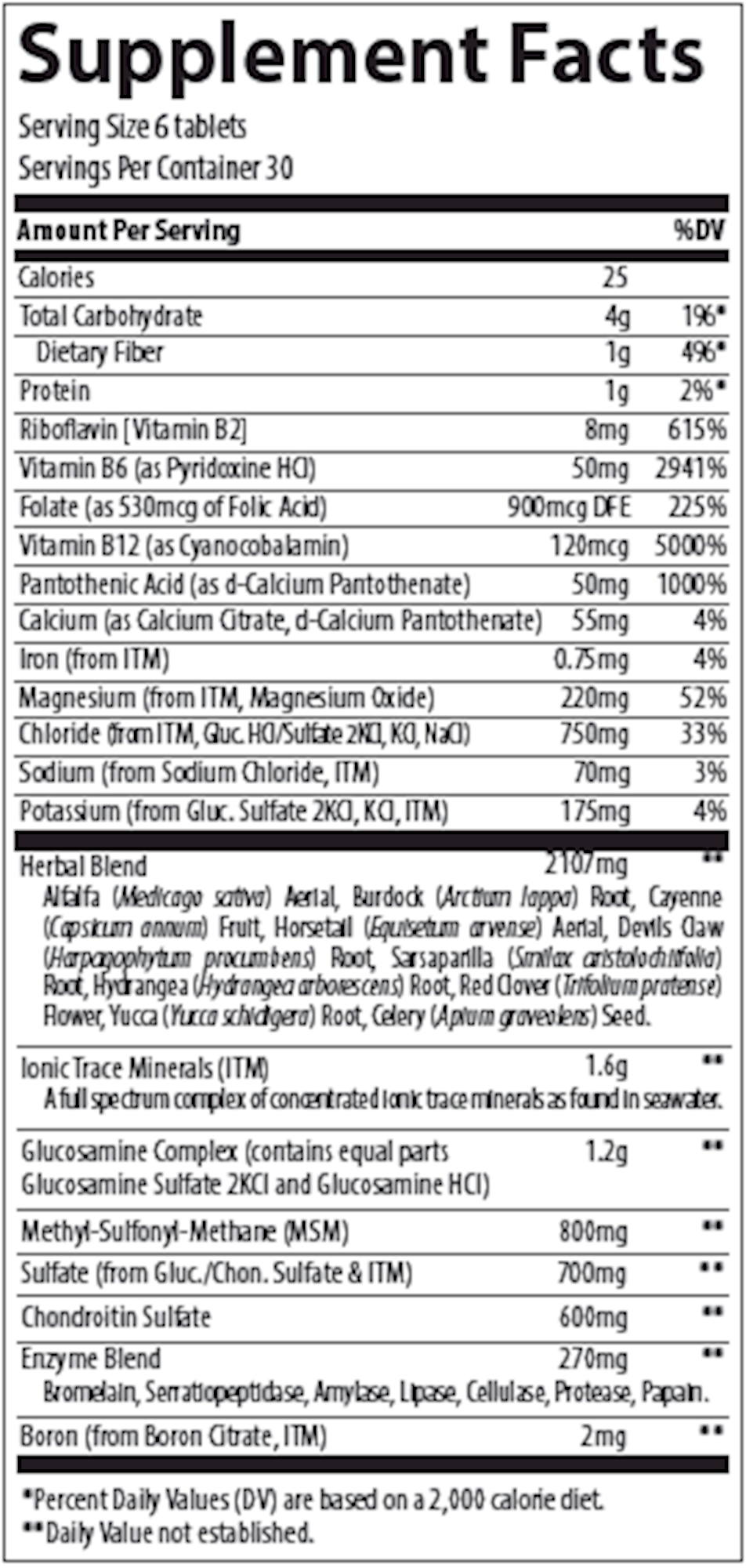 Serving Size: 6 Tablet Servings Per Container: 30 Disclaimer Amount Per Serving Calories 20 Total Carbohydrate 4 g Dietary Fiber 1 g Protein 1 g Calcium (as Calcium Amino Acid Chelate) 355 mg Iron 1 mg Magnesium (from ConcenTrace, Magnesium Oxide) 380 mg Chloride (from ConcenTrace, Sodium Chloride, Potassium Chloride) 1075 mg Sodium 75 mg Potassium (as Potassium Chloride) 95 mg Herbal Blend (Alfalfa Leaf, Burdock Root, Capsicum Fruit, Devils Claw Tuber, Sarsaparilla Root, Turmeric Root, and Yucca Root) 2.7 g Low-Sodium ConcenTrace (A complex of over 72 ionic trace minerals from Utahs inland sea, the Great Salt Lake) 2.1 g Sulfate (from ConcenTrace, Calcium Sulfate) 130 mg Enzyme Complex (120 GDU Units of Bromelain concentrate plus the following natural source enzymes: Amylase, Protease, Lipase, Cellulase) 75 mg Boron (as Boron Citrate) 4 mg Other ingredients: Stearic acid, microcrystalline cellulose, croscarmellose sodium, calcium stearate, silicon dioxide