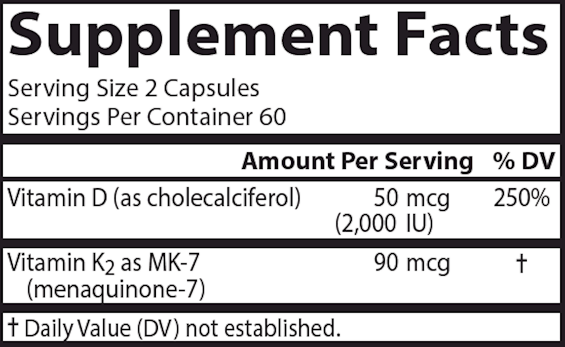 Serving Size: 2 Vegetable Capsule Servings Per Container: 60 Disclaimer Amount Per Serving Vitamin D3 (as cholecalciferol) (2000 IU) 50 mcg Vitamin K 2 as MK-7 (menaquinone-7) 90 mcg Other ingredients: Cellulose, hydroxypropyl methylcellulose, glycerol monostearate, magnesium stearate (veg.), silicon dioxide