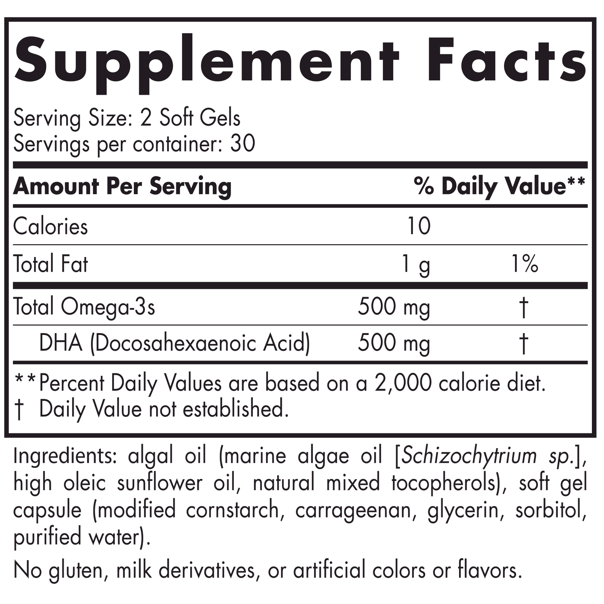 Serving Size: 2 SoftGel Servings Per Container: 30 Disclaimer Amount Per Serving Calories 10 Total fat 1 g Total omega-3s 500 mg DHA (docosahexaenoic acid) 500 mg Other ingredients: Algal oil (marine algae oil [schizochytrium sp.], high oleic sunflower oil, natural mixed tocopherols, soft gel capsule [modified cornstarch, carrageenan, glycerin, sorbitol, purified water), carrageenan, glycerin, sorbitol, purified water