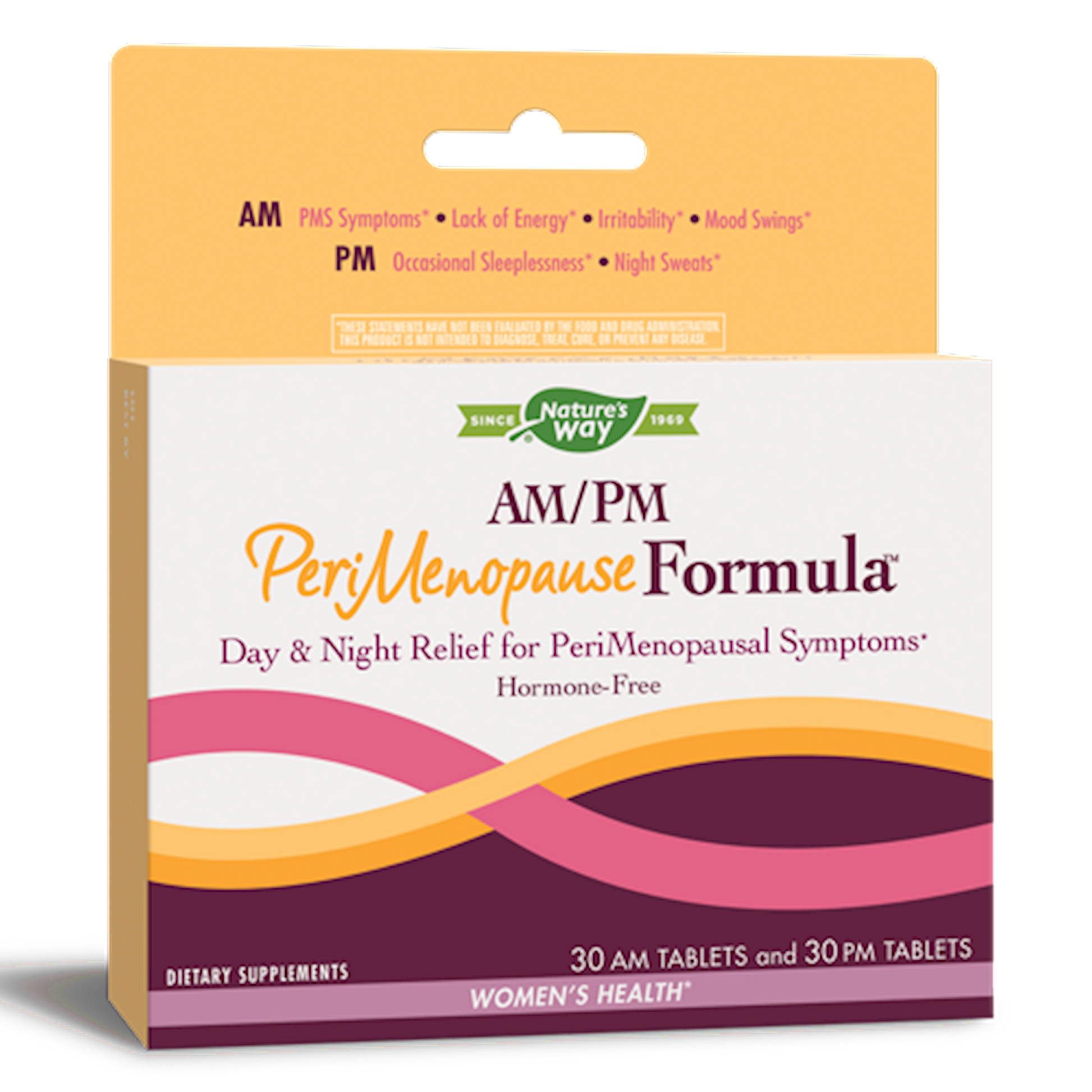 2 Targeted Dietary Supplements AM FORMULA . Hormone-Free 24-Hour Relief for PeriMenopausal Symptoms AM - PMS Symptoms Lack of Energy Irritabilit Mood Swings PM - Occasional Sleeplessness Muscle Tension* Night Sweats 24-hour Perimenopause Symptom Relief* Situation: Estrogen levels become erratic and are often elevated during perimenopause. This hormone shift can start around age 35 and last until you're about 50. AM/PM PeriMenopause Formula allows a woman to have control over her own "change of life" journey. * AM Formula Natural Ingredient - Natural Support Green Tea - For Energy and weight management* Chaste Berry - For menstrual symptoms* Rhodiola - For concentration, mental alertness and endurance PM Formula Black Cohosh - For relief of occasional night sweats and mood swings* Valerian and Hops - For relaxation L-Theanine - For alleviating nighttime muscle tension and to promote restful sleep*