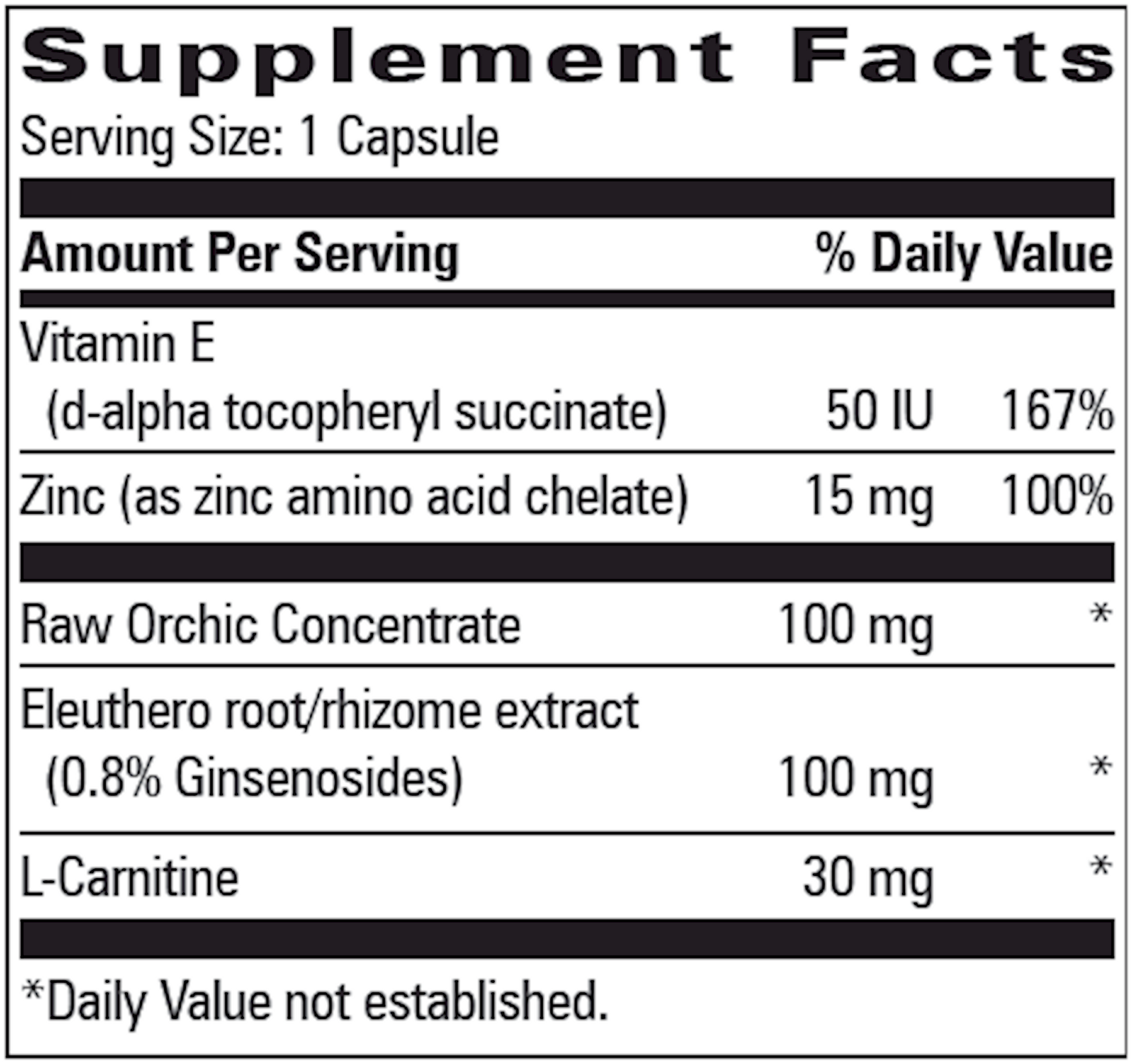 Serving Size: 1 Capsule Disclaimer Amount Per Serving Vitamin E (d-alpha tocopheryl succinate) 50 IU Zinc (as zinc aspartate) 15 mg Raw Orchic Concentrate (porcine) 100 mg Eleutherococcus senticosus 100 mg L-Carnitine 30 mg Other ingredients:
