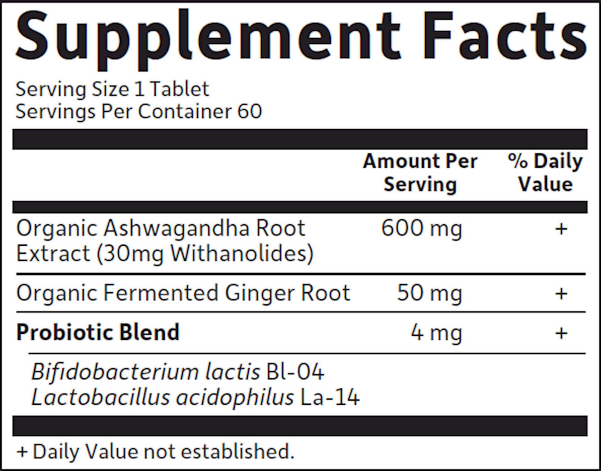 Serving Size: 1 Tablet Servings Per Container: 60 Disclaimer Amount Per Serving Organic Ashwagandha Root 600 mg Extract (Withanolides) 30 mg Organic Fermented Ginger Root 50 mg Probiotic Blend 4 mg Bifidobacterium lactis Bl-04 Lactobacillus acidophilus La-14 Other ingredients: Clean tablet technology blend (patent pending), Organic Gum Arabic, Organic Dextrose, Organic Coating, Organic Tapioca Maltodextrin, Organic Sunflower Lecithin, Organic Palm Oil, Organic Guar Gum
