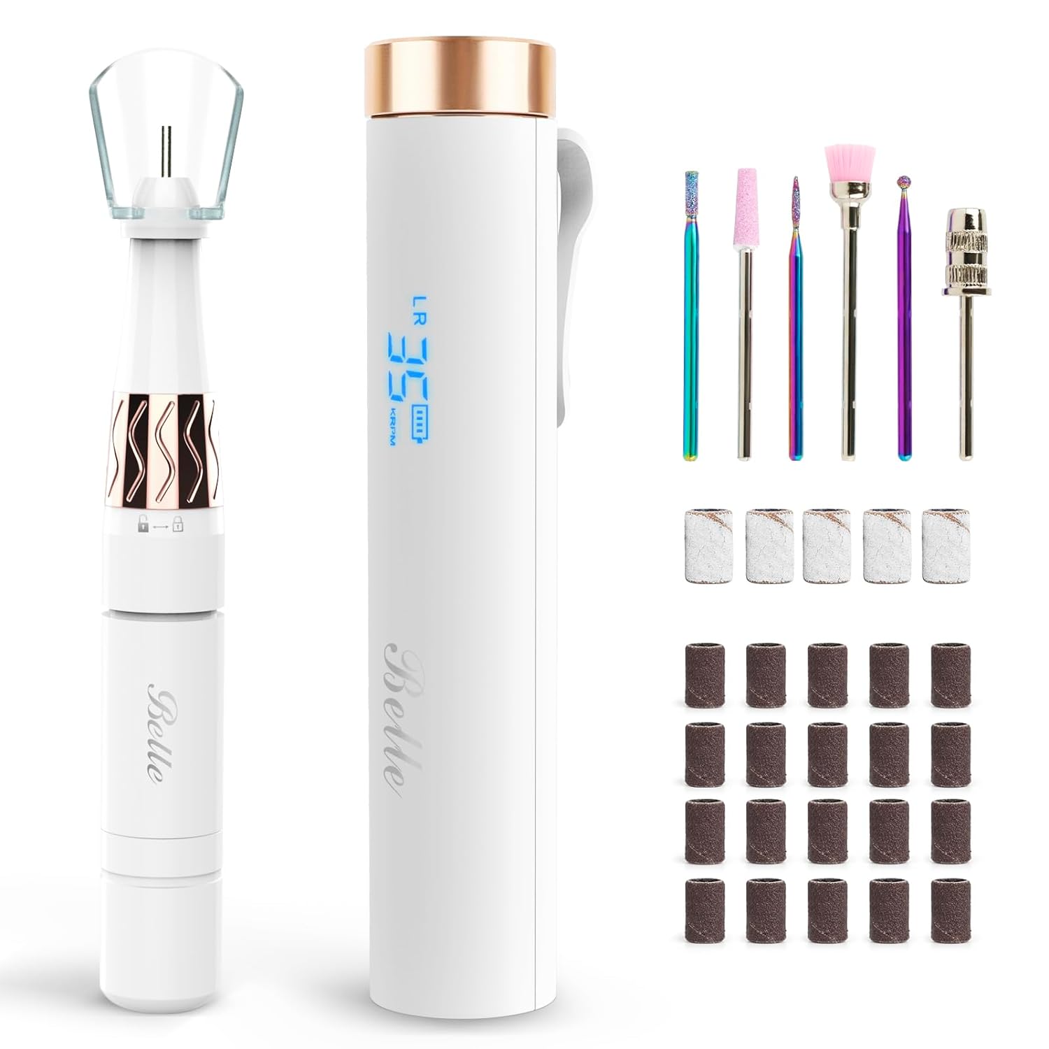 Belle Nail Drill Machine, Electric 35000RPM Grace Rechargeable Nail File for Beginners, Portable Cordless Manicure Pedicure for Acrylic Gel Nails with 6 Bits, 25 Sanding Bands and Carrying Case
