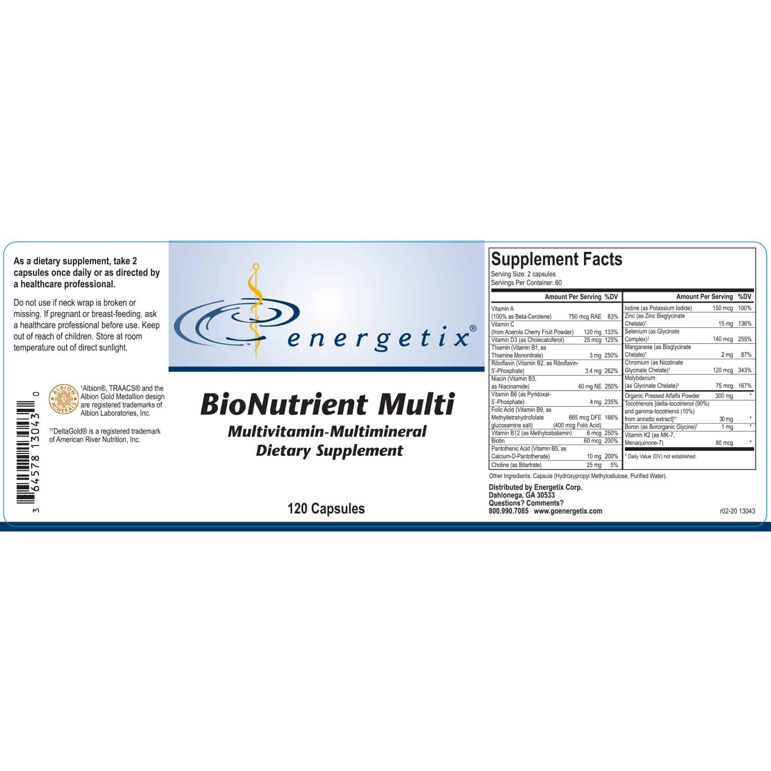 BioNutrient Multi is a bioavailable multi-vitamin including methylated B vitamins, glycinate chelated minerals, and whole food nutrition in an excipient-free, all-vegetable capsule. These vitamins and minerals work to convert macronutrients into a more bioavailable form of nutrition with the assistance of the alfalfa organic grass juice powder.
