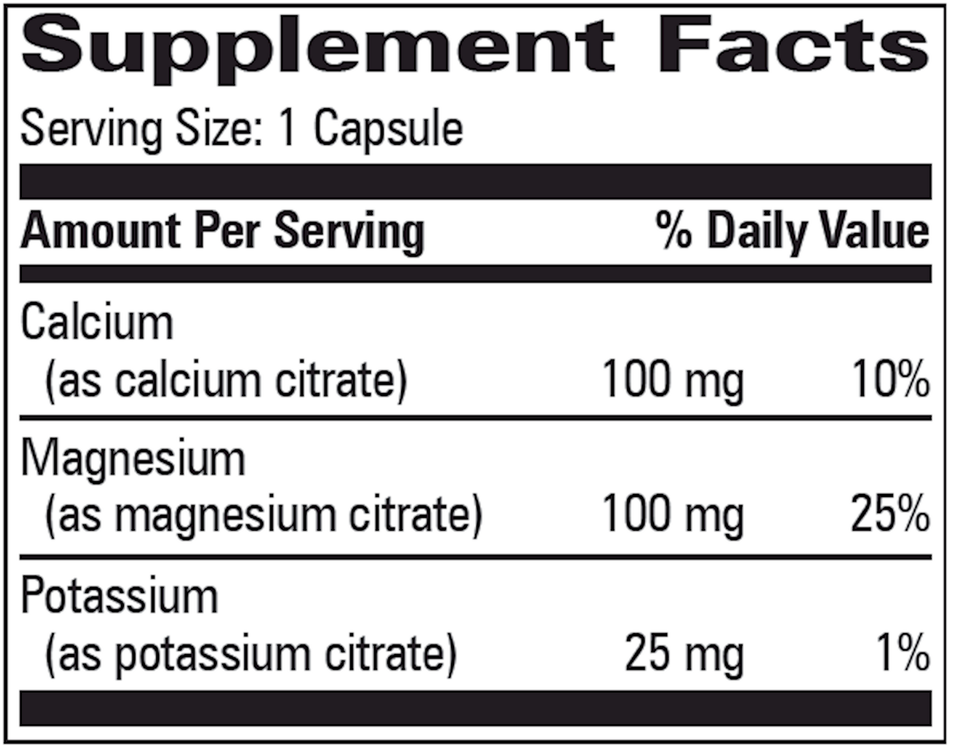 Serving Size: 1 Capsule Servings Per Container: 100 Disclaimer Amount Per Serving Elemental Calcium 100 mg From Calcium Citrate and Calcium Carbonate 338 mg Elemental Magnesium 100 mg From Magnesium Citrate 625 mg Elemental Potassium 25 mg From Potassium Citrate 69 mg Other ingredients: gelatin