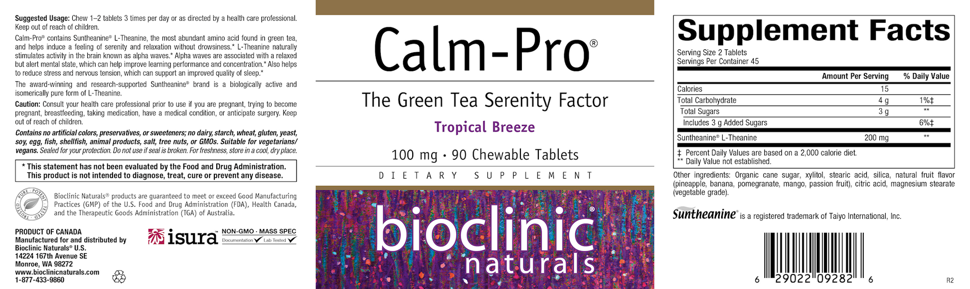 Serving Size: 2 Tablet Servings Per Container: 45 Disclaimer Amount Per Serving Calories 15 Total Carbohydrate 4 g Sugars 3 g Sunthanine L-Theanine 200 mg Other ingredients: Organic cane sugar, xylitol, stearic acid, silica, natural fruit flavor (pineapple, banana, pomegranate, mango and passion fruit), citric acid, magnesium stearate (vegetable grade)