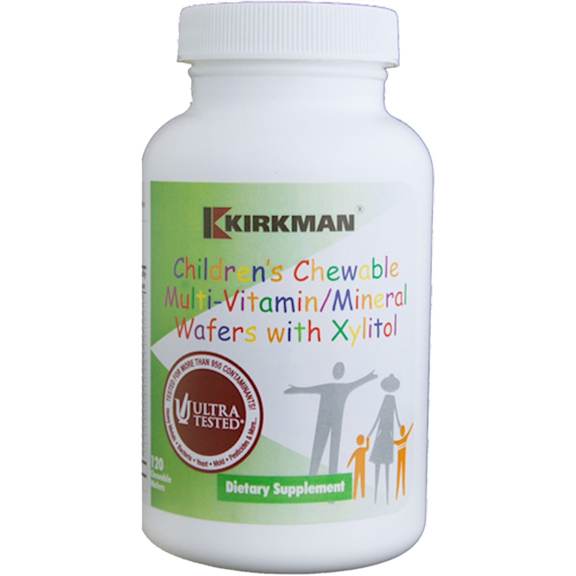 A potent chewable multi-vitamin without artificial flavors formulated for children. Free of common allergens. Gluten and casein free. Ultra Tested. Kirkmans Childrens Chewable Multi-Vitamin/Mineral Wafers with Xylitol offer the same basic ingredients as Kirkmans 0288-120 childrens chewable multi-vitamin wafers but does not contain artificial sweeteners. Wafers are sweetened with xylitol and dextrose and flavored with a delicious natural mango/peach flavor. Kids love them, which makes compliance easy. This product contains higher potencies than many commercially sold multi-vitamins and offers trace minerals and coenzyme Q10 as well. Most importantly, it offers a better choice for a chewable product because it contains no colorings and only fruit-based flavorings. Sensitive children often react to the artificial coal tar colorings and artificial flavoring chemicals present in most commercially sold kids vitamins.