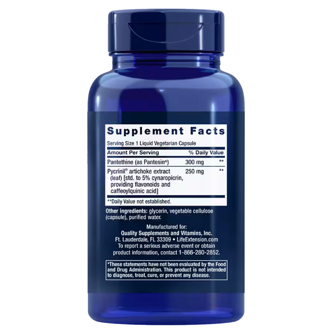 Serving Size: 1 Vegetable Capsule Servings Per Container: 60 Disclaimer Amount Per Serving Pantethine (as Pantesin) 300 mg Pycrinil Artichoke extract (leaf) [std. to 5% cynaropicrin (12.5 mg) and providing flavonoids and caffeoylquinic acid] 250 mg Other ingredients: Glycerin, vegetable cellulose (capsule), purified water