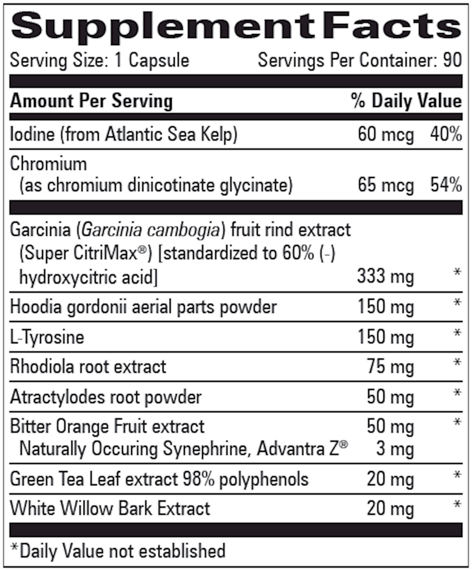 Serving Size: 1 Capsule Disclaimer Amount Per Serving Iodine (from Atlantic Sea Kelp) 100 mcg Chromium (as chromium dinicotinate glycinate) 65 mcg Super CitriMax Garcinia(fruit) Standardized to 60% (-)Hydroxycitric Acid 333 mg Hydroxycitric Acid White Willow Bark Extract 20 mg Hoodia gordonii (fruit) 12:1 Extract 150 mg L-Tyrosine 150 mg Rhodiola Extract (root) 75 mg Chang-Zhu Atractylodes (root) 50 mg Advanta Z Bitter Orange Extract (fruit) 50 mg Naturally Occuring Synephrine 3 mg Green Tea Extract (leaf) 90% catechins 20 mg Other ingredients: gelatin, magnesium stearate