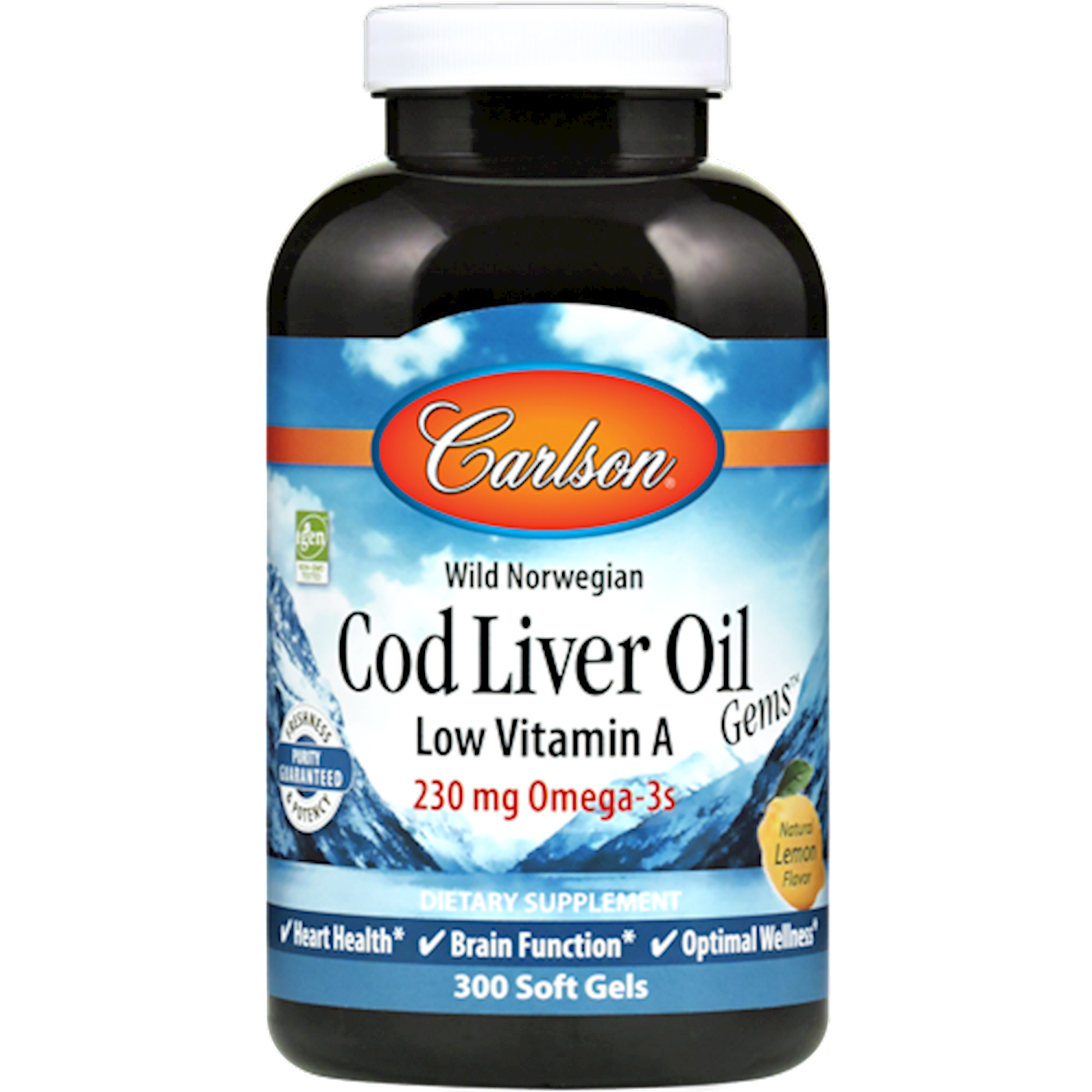 Each Cod Liver Oil soft gel provides 230 mg of omega-3s, including EPA and DHA, which support heart, brain, vision, and joint health.* This special formulation is also low in vitamin A and contains 80 IU of vitamin D3. To ensure maximum freshness, Cod Liver Oil is closely managed from sea to store. Carlson Labs sources the highest quality Arctic cod off the coast of Norway using traditional, sustainable methods. The same day they're caught, the fish are delivered to a highly regulated Norwegian facility for processing purification. Like all Carlson omega-3s, freshness, potency, and purity are guaranteed. Promotes heart and brain function, and optimal wellness* 230 mg of omega-3s per soft gel Low in vitamin A Sustainably sourced from wild-caught Norwegian Arctic cod IFOS and IGEN non-GMO certified Freshness, potency, and purity guaranteed