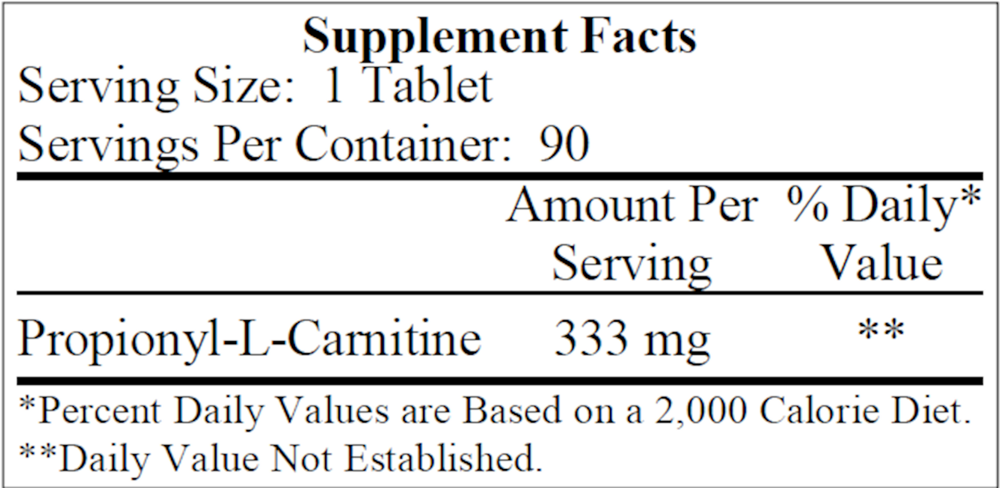 Serving Size: 1 Tablet Servings Per Container: 90 Disclaimer Amount Per Serving Propionyl-L-Carnitine 333 mg Other ingredients: Microcrystalline cellulose, Stearic acid, Silicon dioxide, Dicalcium phosphate, L-Leucine, Food glaze