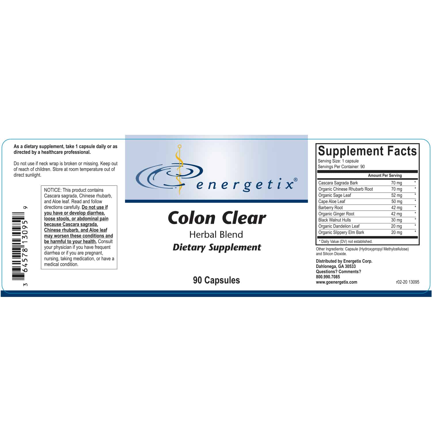 Serving Size: 1 Capsule Servings Per Container: 90 Disclaimer Amount Per Serving Proprietary Herbal Blend 395 mg WIldcrafted Cascara Sagrada Bark Organic Chinese Rhubarb Root Organic Sage Leaf WIldcrafted Cape Aloe Leaf WIldcrafted Barberry Root Organic Ginger Root Wildcrafted Black Walnut Hulls Organic Dandelion Leaf Organic Slippery Elm Bark) Other ingredients: Vegetarian Capsules [Hypromellose (Vegetable Cellulose)], Silica