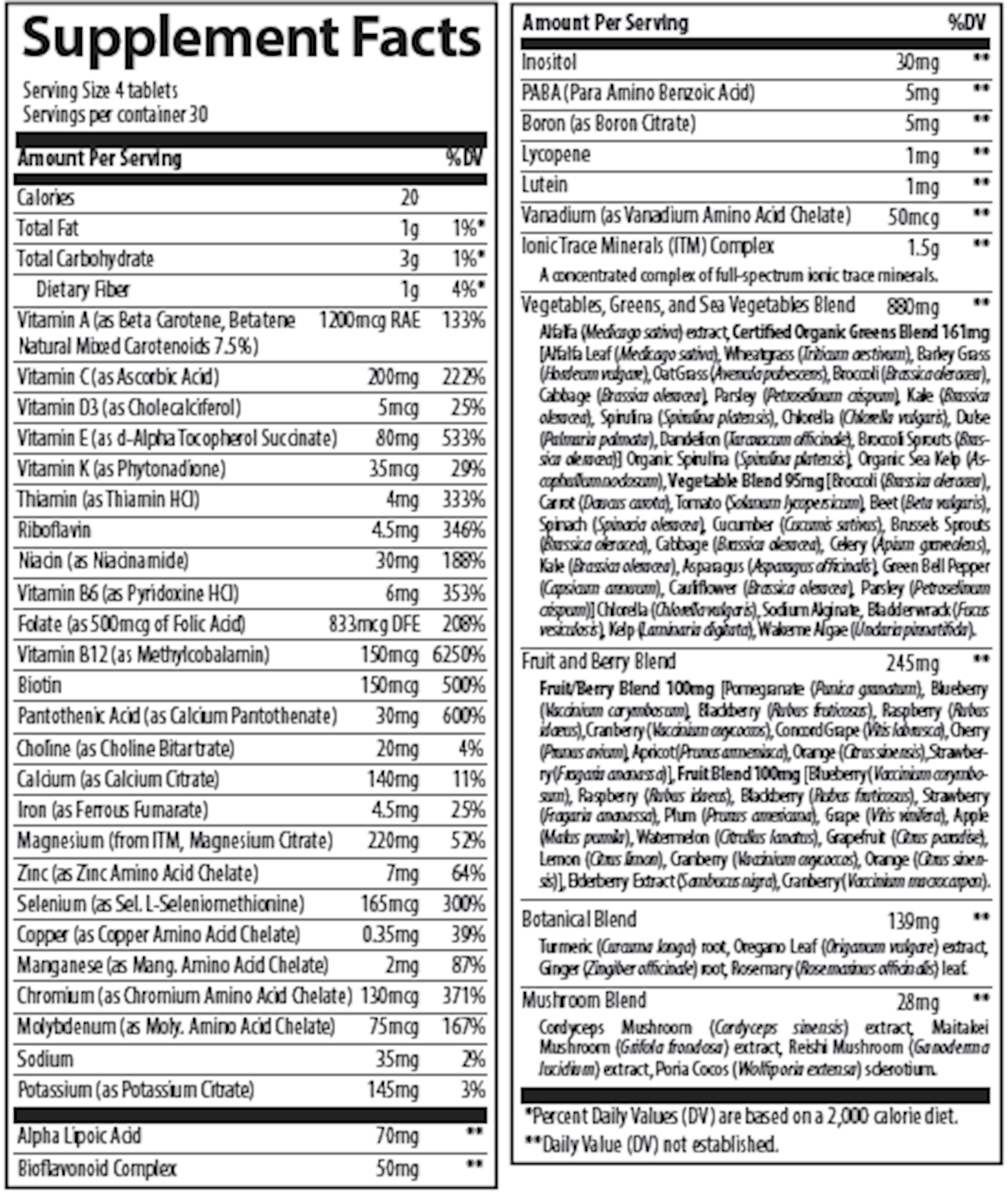Serving Size: 4 Tablet Servings Per Container: 30 Disclaimer Amount Per Serving Calories 20 Total Fat 1 g Total Carbohydrate 3 g Dietary Fiber 1 g Vitamin A (as Beta Carotene) 8200 IU Vitamin C (as Ascorbic Acid) 200 mg Vitamin D3 (as Cholecalciferol) 200 IU Vitamin E (as d-Alpha Tocopherol Succinate) 120 IU Vitamin K (as Phytonadione) 40 mcg Thiamin (as Thiamin HCl) 4.5 mg Riboflavin 4.5 mg Niacin (as Niacinamide) 30 mg Vitamin B6 (as Pyridoxine HCl) 6 mg Folic Acid 500 mcg Vitamin B12 (as Methylcobalamin) 250 mcg Biotin 150 mcg Pantothenic Acid (as Calcium Pantothenate) 35 mg Calcium (as Calcium Citrate) 140 mg Iron (as Ferrous Fumarate) 4.5 mg Magnesium (from ConcenTrace, Mag. Oxide ) 220 mg Zinc (as Zinc Amino Acid Chelate) 7.5 mg Selenium (as Sel. L-Seleniomethionine) 165 mcg Copper (as Copper Amino Acid Chelate) 0.35 mg Manganese (as Mang. Amino Acid Chelate) 2 mg Chromium (as Chromium Amino Acid Chelate) 130 mcg Molybdenum (as Moly. Amino Acid Chelate) 75 mcg Sodium 35 mg Potassium (as Potassium Citrate) 145 mg Alpha Lipoic Acid 75 mg Bioflavonoid Complex 50 mg Inositol 30 mg Choline (as Choline Bitartrate) 20 mg PABA (Para Amino Benzoic Acid) 5 mg Boron (as Boron Citrate) 2 mg Lycopene 1 mg Lutein 1 mg Vanadium (as Vanadium Amino Acid Chelate) 50 mcg Vegetables Greens Sea Vegetables Blend 870 mg (Wheat Barley & Oat] Cabbage Broccoli Kale Parsley Spirulina Cracked Cell Chlorella Kelp Dulse Dandelion Greens Broccoli Sprouts) Spirulina Algae Vegetable Blend (Carrot Broccoli Tomato Cucumber Kale Spinach Parsley Cabbage Celery Cauliflower Asparagus Brussel Sprouts Onion Garlic Ginger) (Chlorella Algae Sodium Alginate Bladderwrack Thallus Kelp Kombu Alaria Dulse Betatene.) Fruit and Berry Blend (Berry Blend 240 mg (Grape Cranberry Bilberry Blueberry Elderberry Raspberry And Strawberry) Fruit Blend (Apple Grape Grapefruit Orange Pineapple Lemon Lime Cherry Watermelon Pear Mango Strawberry Papaya Tangerine Apricot) (Cranberry Fruit Extract European Elder Fruit Extract.) Botanical Blend 125 mg (Turmeric Root Ginger Root Oregano Leaf Rosemary Leaf.) Mushroom Blend 36 mg (Cordyceps Extract Maitake Extract Poria Sclerotium Extract Reishi Extract Turkey Tails Extract Grifola.) Other ingredients: Microcrystalline cellulose, stearic acid, croscarmellose sodium, magnesium stearate, silicon dioxide